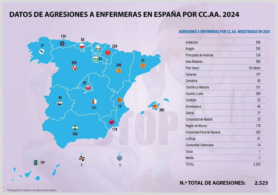 CONSEJO GENERAL DE ENFERMERÍA .- En 2024 se denunciaron 2525 agresiones a enfermeras en España, una media de siete al día, según el Observatorio de Agresiones del Consejo General de Enfermería (CGE). Aunque la cifra ha bajado un 10% respecto a 2023, el CGE alerta de una importante infranotificación, especialmente en agresiones verbales.